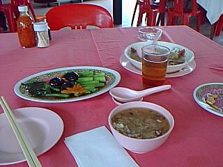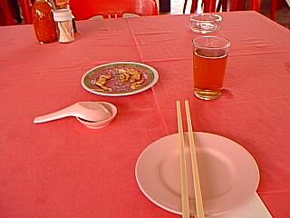 最初に出てきた中国茶とピーナッツを食べながらメニューを見てましたがよく分からん。”ええい〜適当におかゆっぽいのと野菜炒っぽい奴頼んだれ!!” ということで頼みました。本を読んでいると突然”パ〜〜ン!”という音。何やねん!と思っていると後ろのオッチャンが”おしぼり”を開けてる音でした。 自分のおしぼりを使おうとして分かったんですが、はっきり言って”パン”をしないと開きません。私も負けずに”パン”とやって後ろをチラッと見るとオッチャン笑ってました。 おしぼり、ピーナッツ、中国茶すべて有料でした(日本とは違うんですな〜)愛知県にすんでると喫茶店では必ずタダで”ピーナッツ”とか”あられ”が付いてるんでてっきり・・。